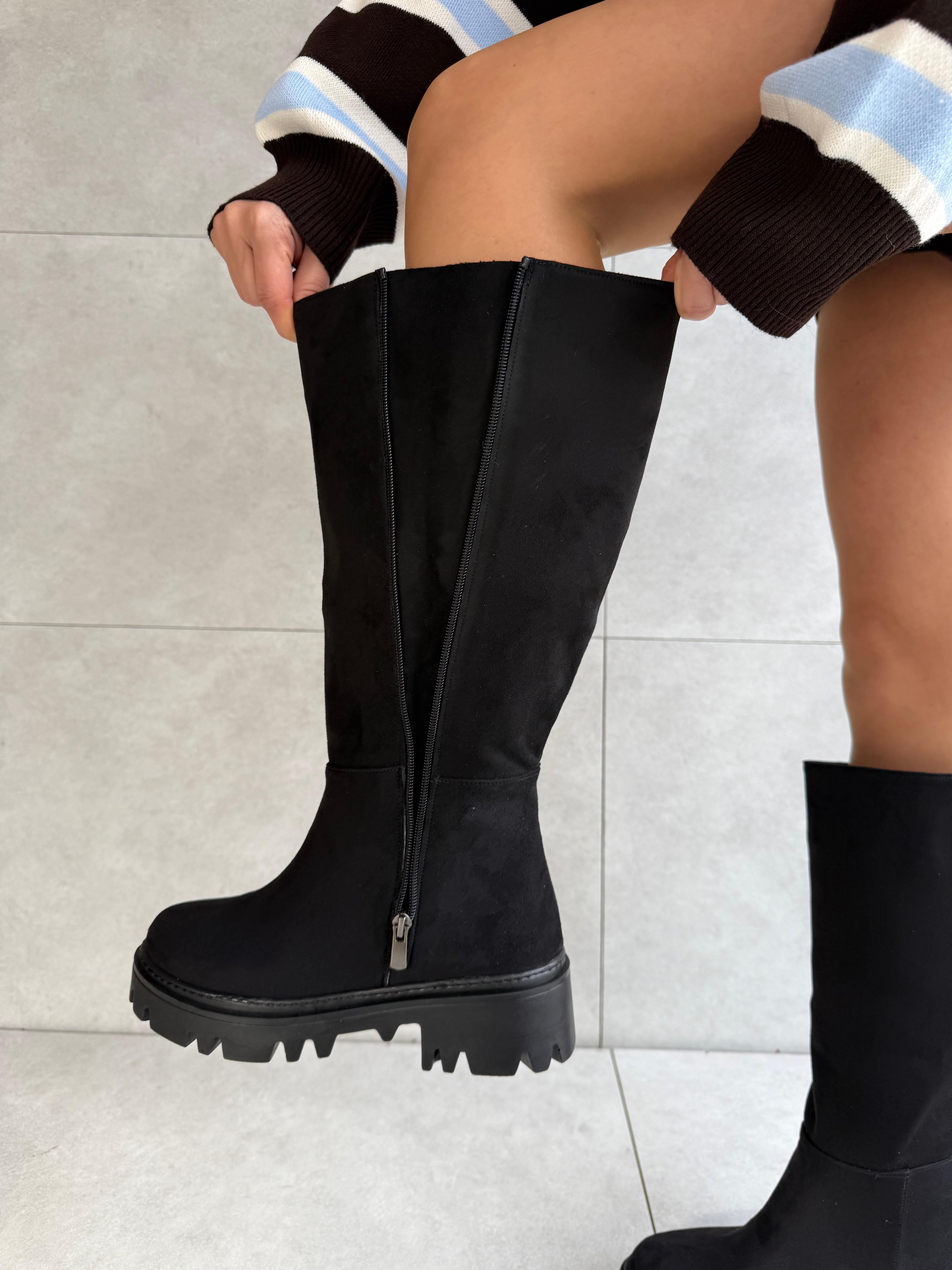 Dena Siyah Süet Renk Kalın Tabanlı Ekstra Geniş Kadın Çizmesi (Dena-Siyah Süet)