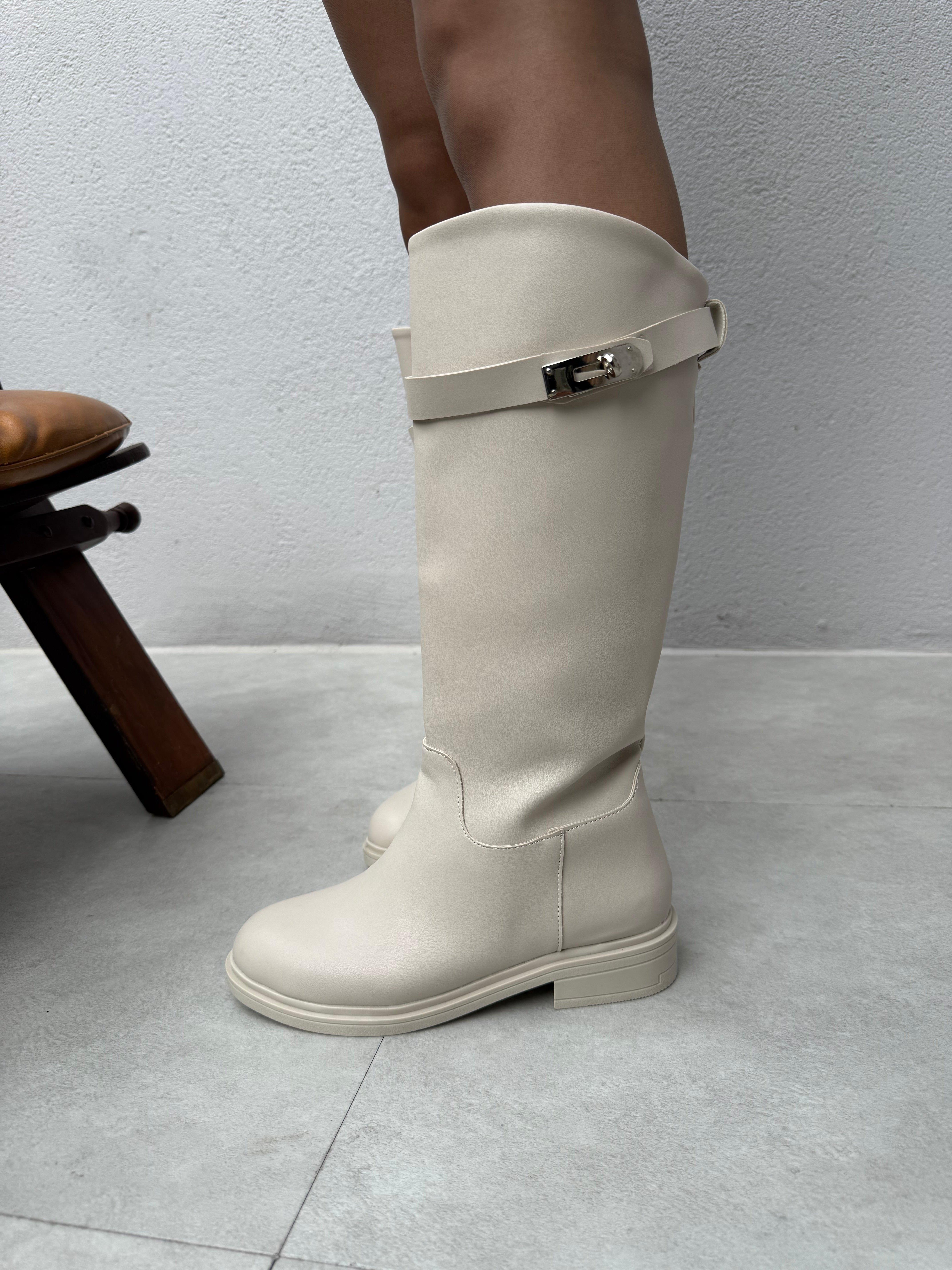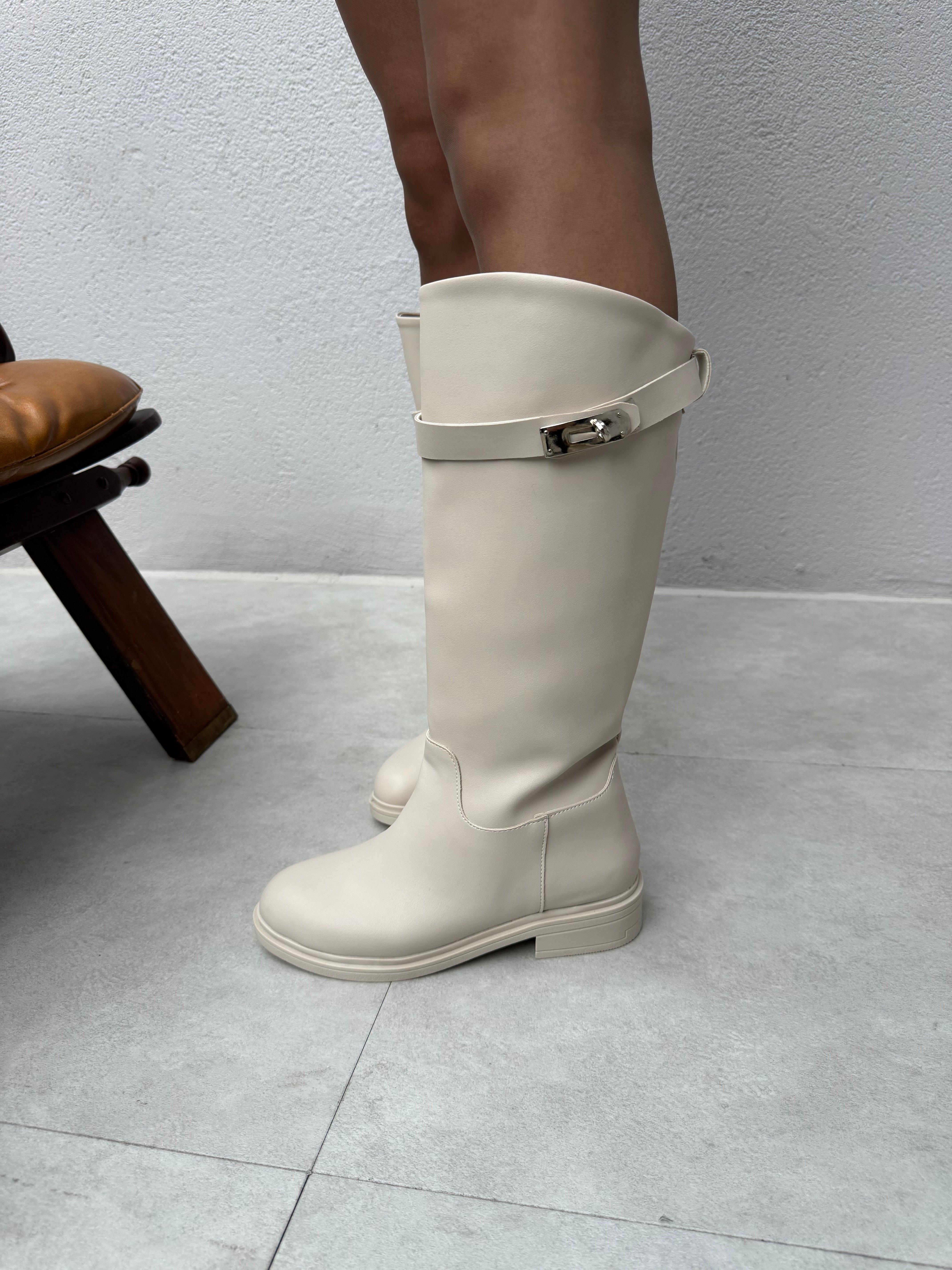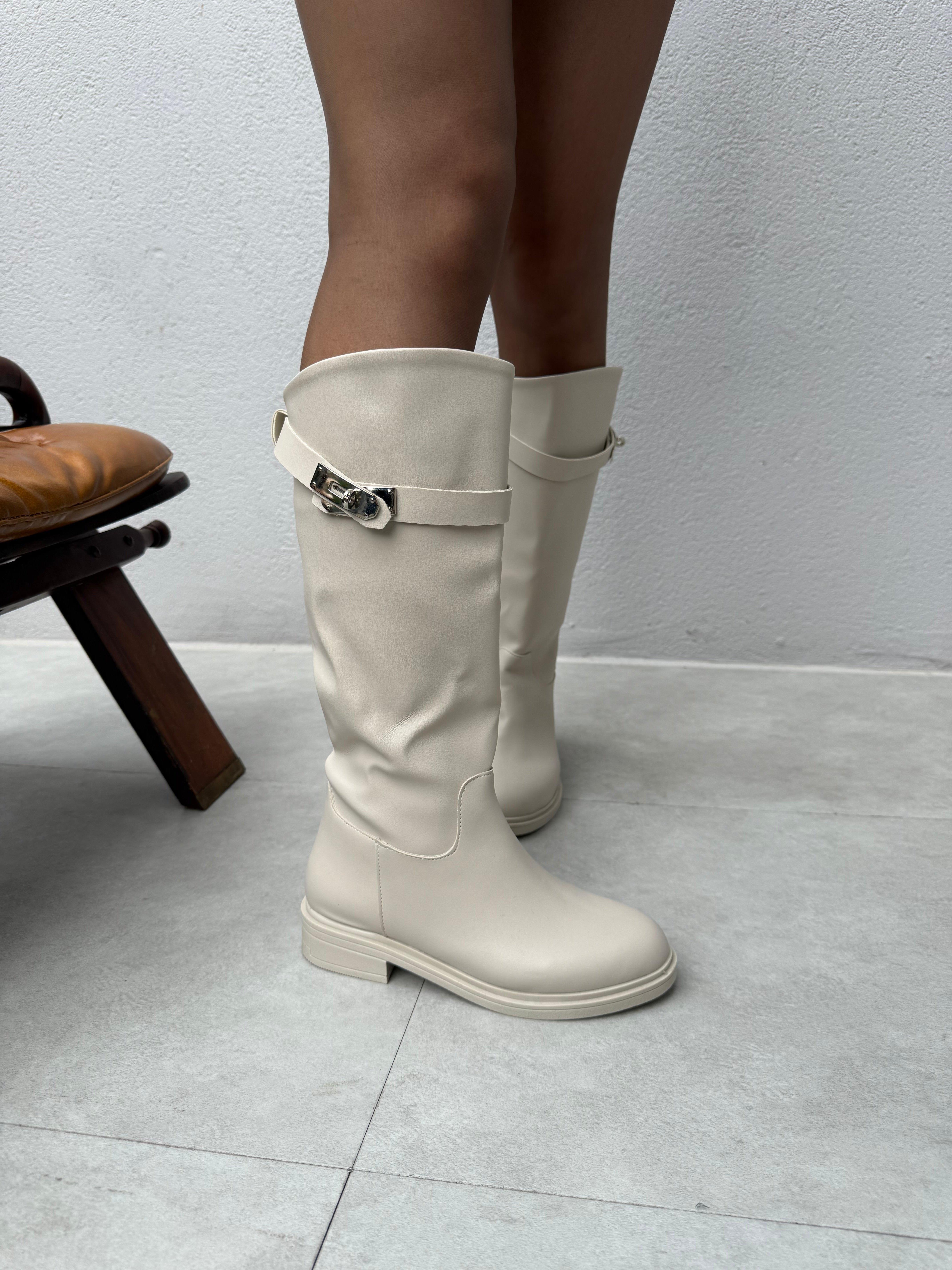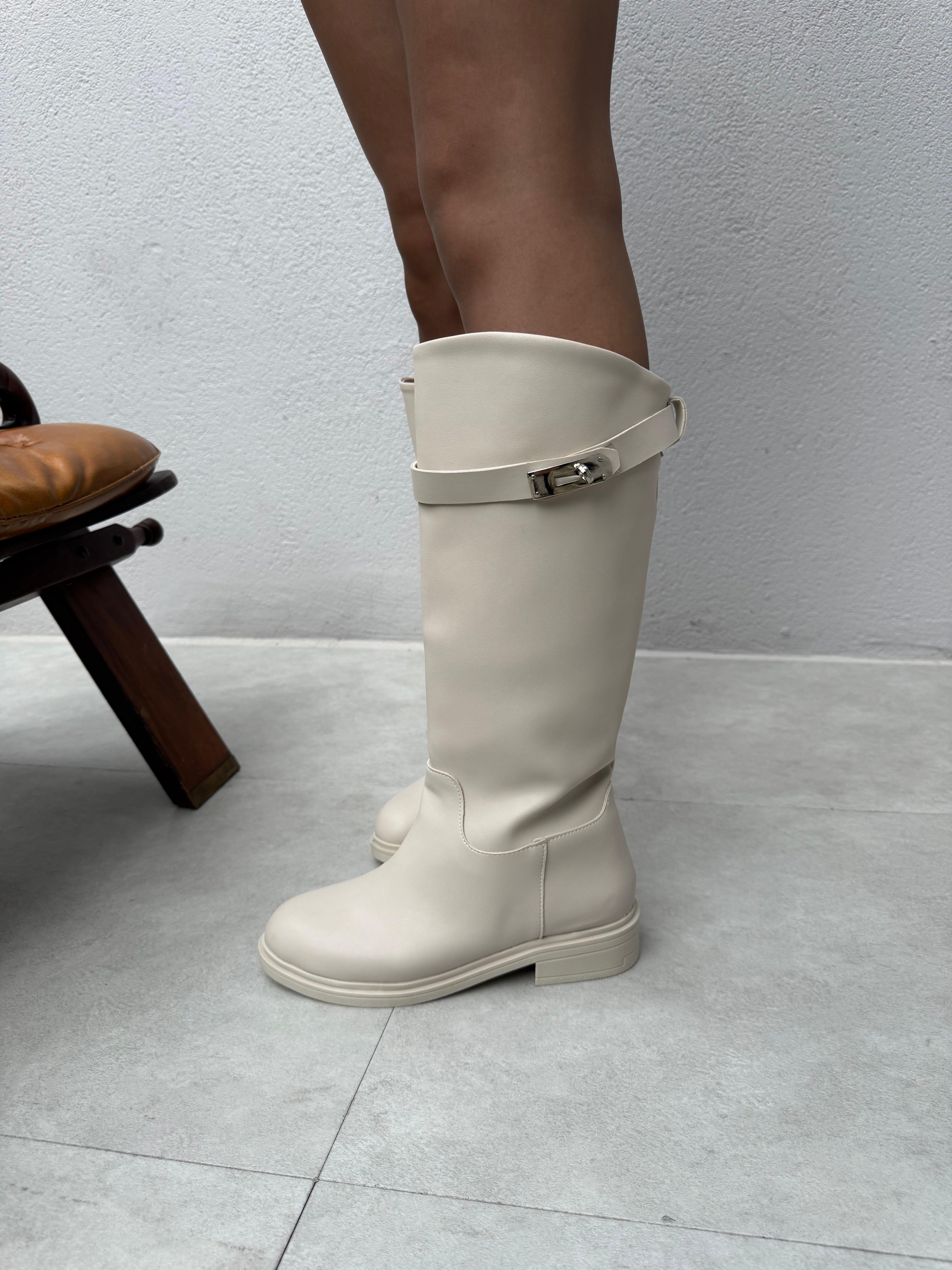 Nadia Toka Detaylı Düz Taban Çizme ( Bej Deri ) (copycopycopycopy41234)